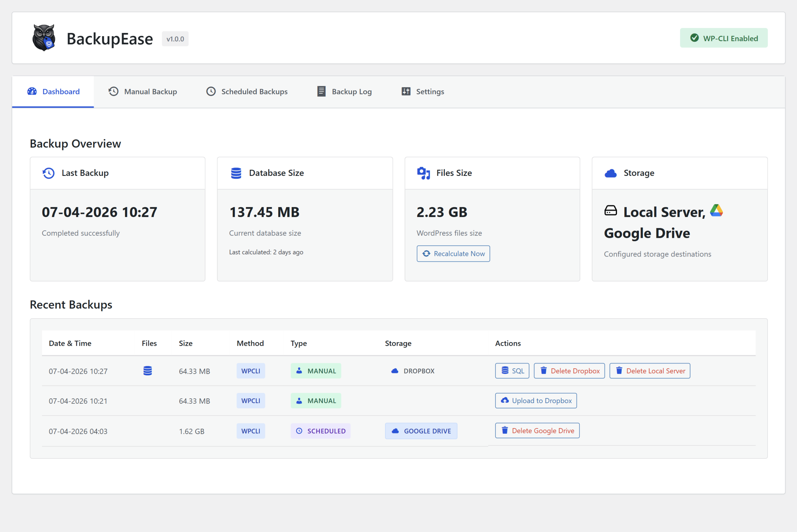 BackupEase provides a comprehensive WordPress backup solution with automated scheduling, multiple storage options, and easy restoration.