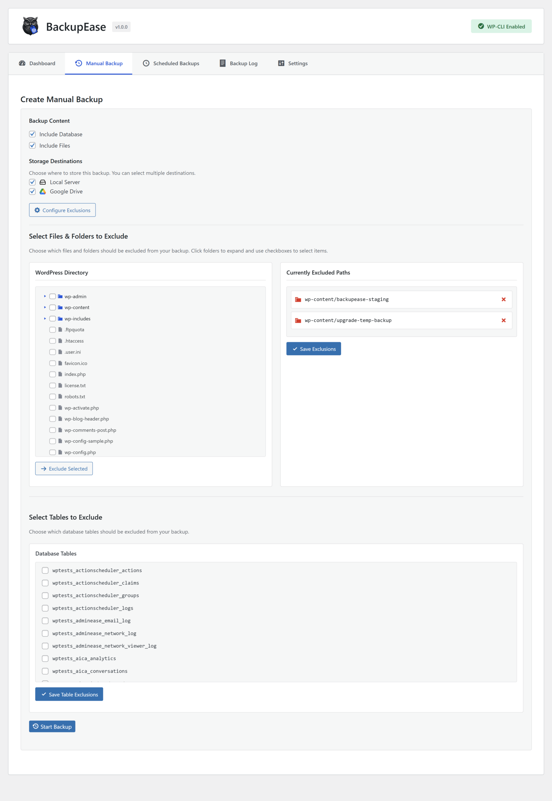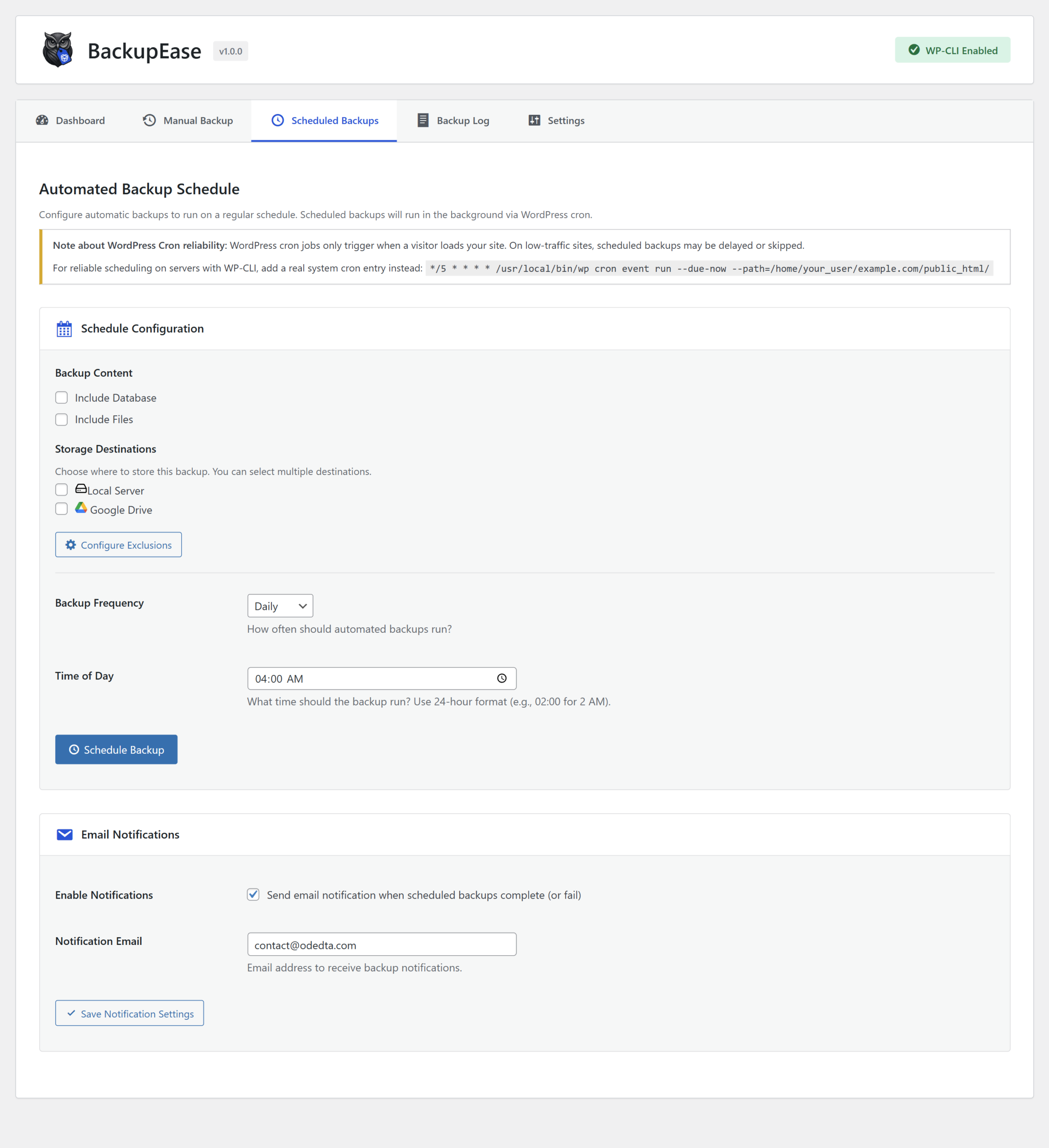 - Intelligent Processing Engine: BackupEase automatically detects WP-CLI for optimal performance with PHP fallback. The plugin leverages WP-CLI for efficient background processing on supported servers. For servers without WP-CLI, it utilizes an automatic chunked processing PHP fallback mode.