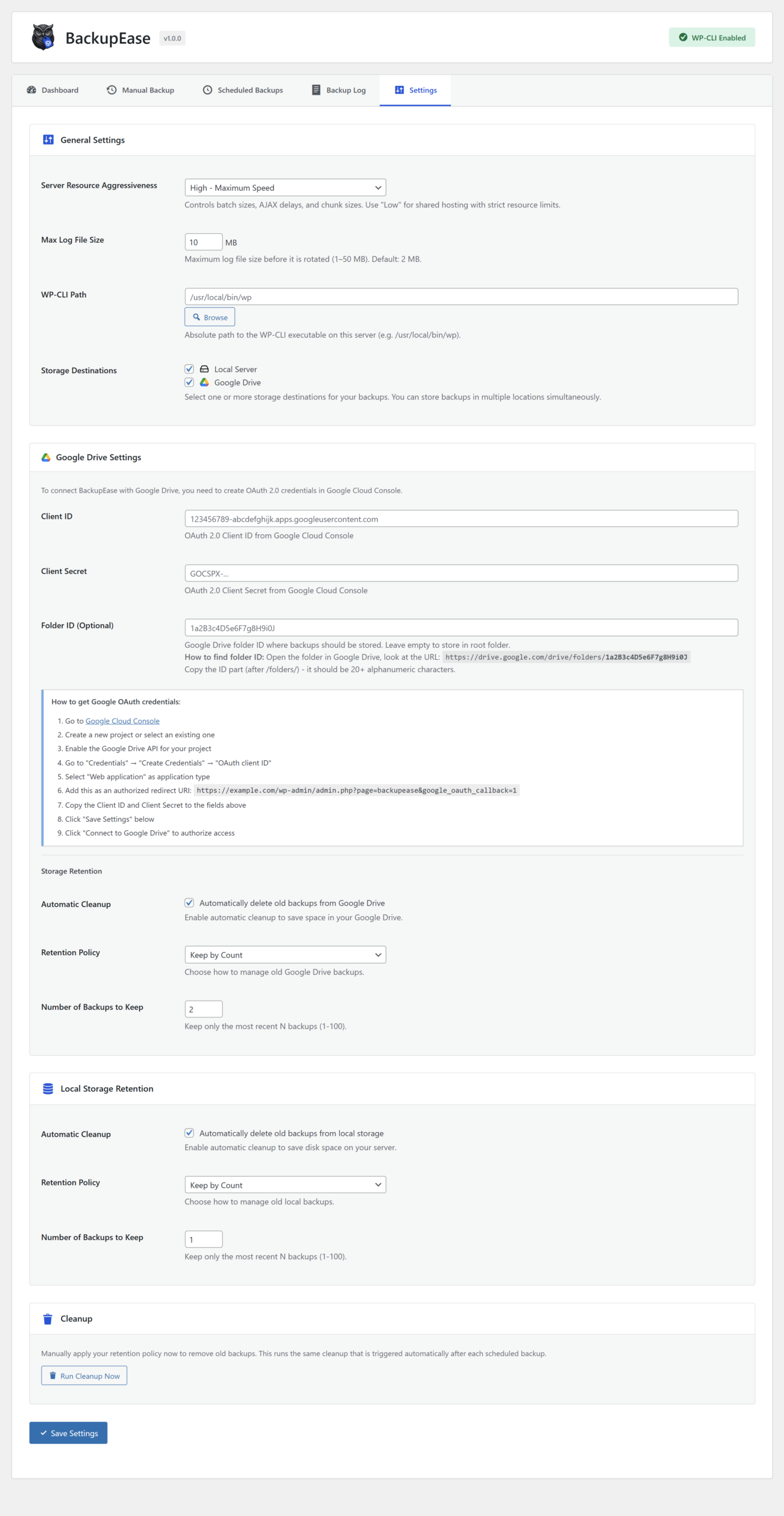 - Cloud & Local Storage: Store backups directly on your web server. Upload backups to Google Drive for off-site storage. The storage system is extensible for additional providers.